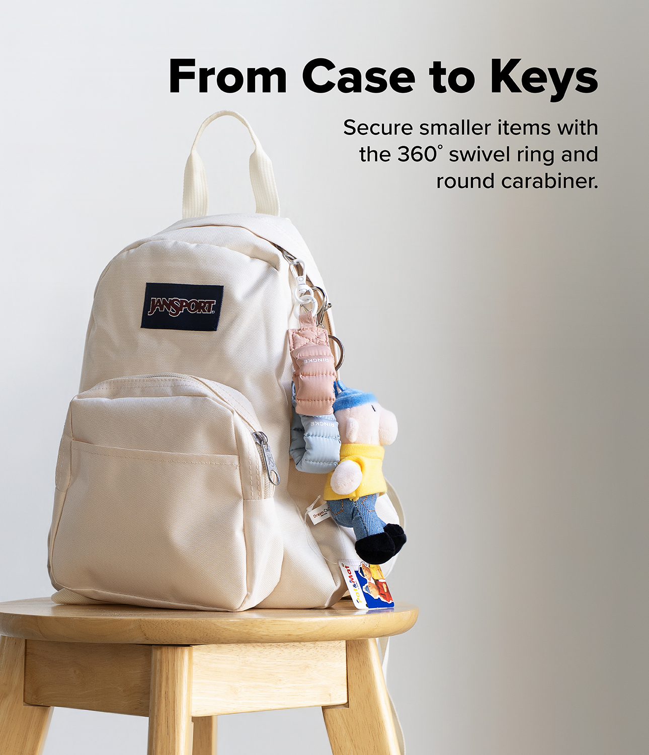 Secure smaller items with 360˚ swivel ring & round carabiner
