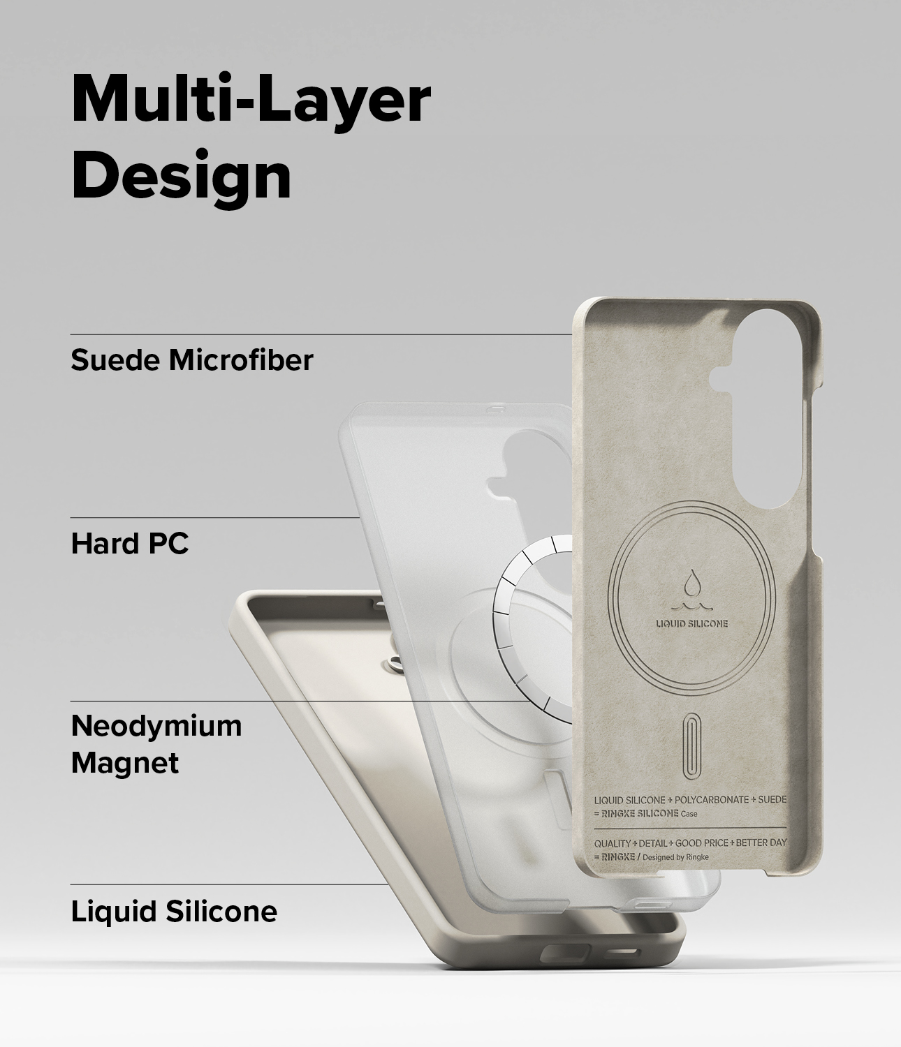 Dynamic three-layer design of premium silicone exterior, durable polycarbonate frame, and velvety microfiber lining.