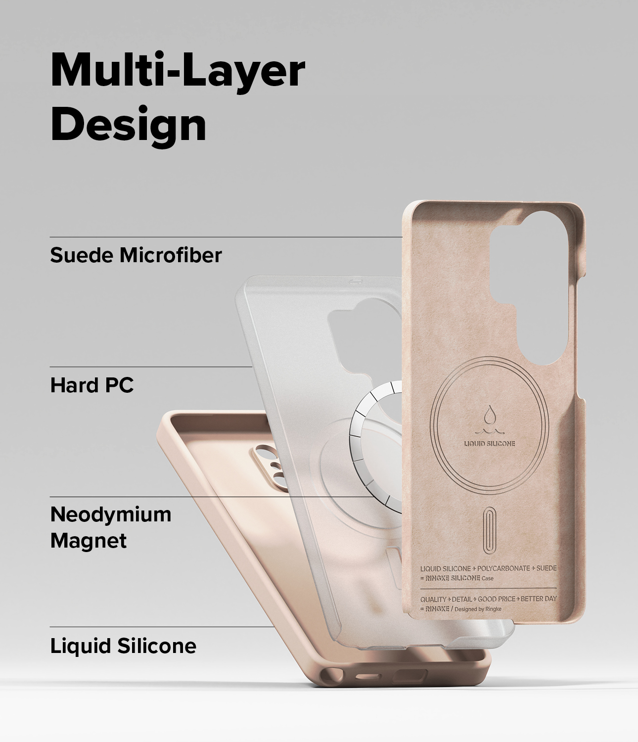 Dynamic three-layer design of premium silicone exterior, durable polycarbonate frame, and velvety microfiber lining.
